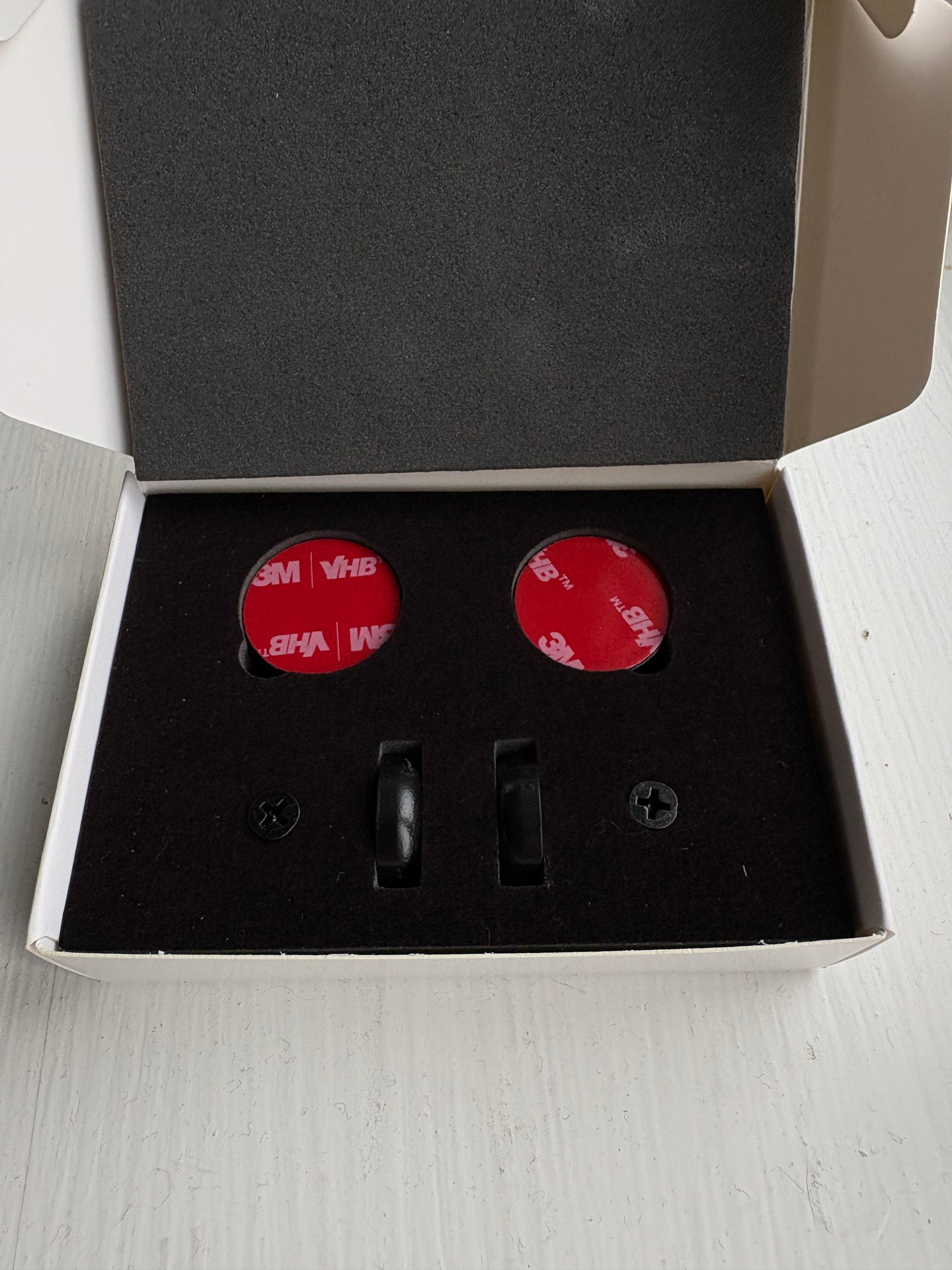 enkelt montage med 2 skruv för att fästa i original hålen i kaross samt 2 plattor med dubbelhäftande för plåten.